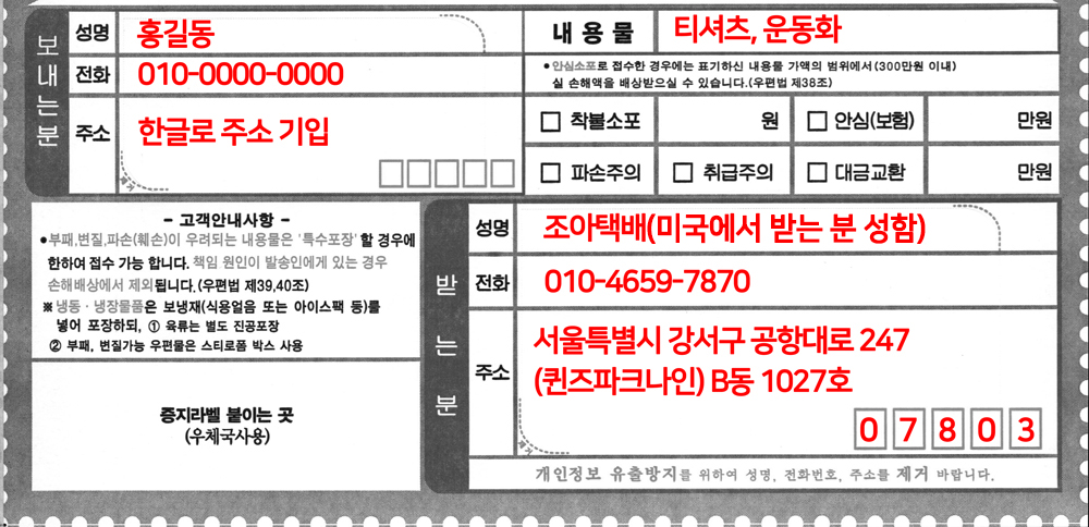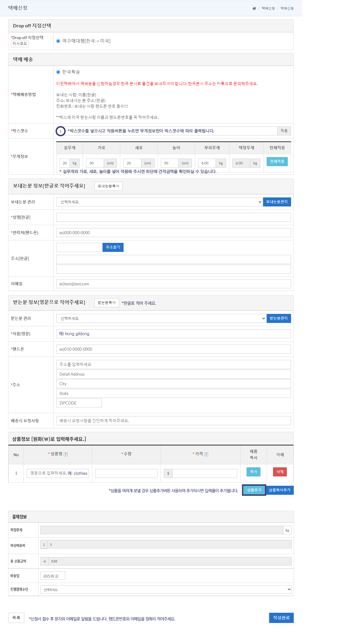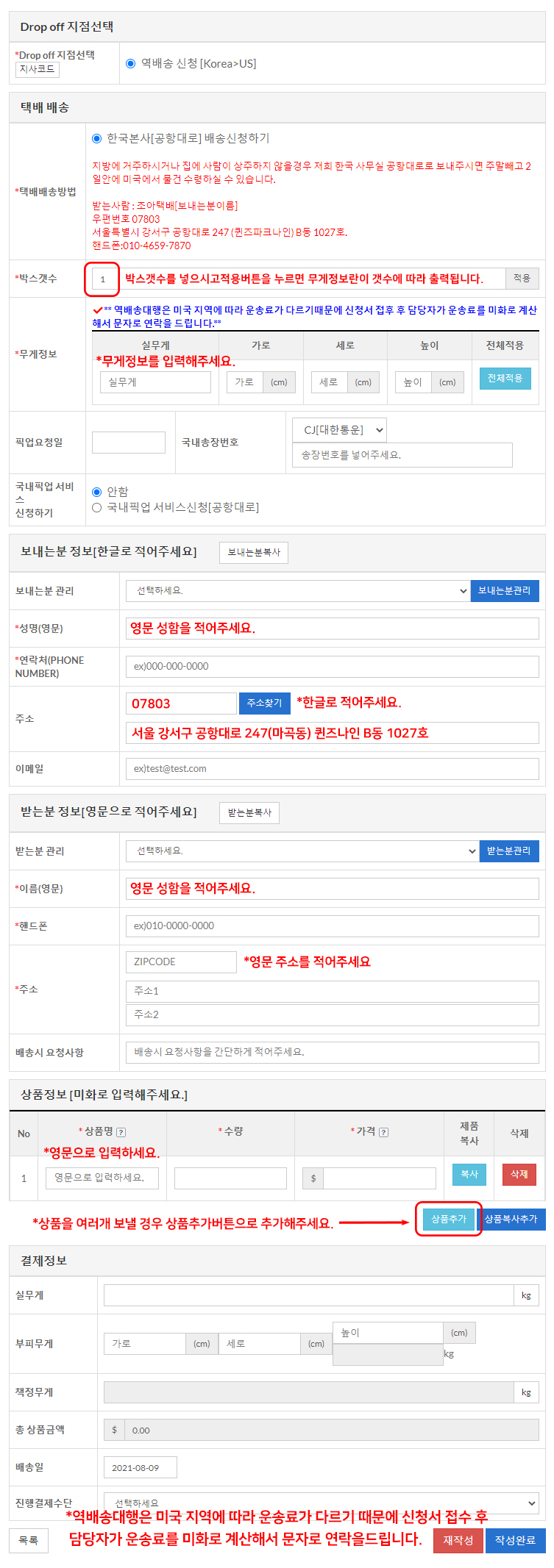 * Packing List 작성시, 개별박스별 해당 제품내역을 별도기입해야만 통관이 가능합니다.